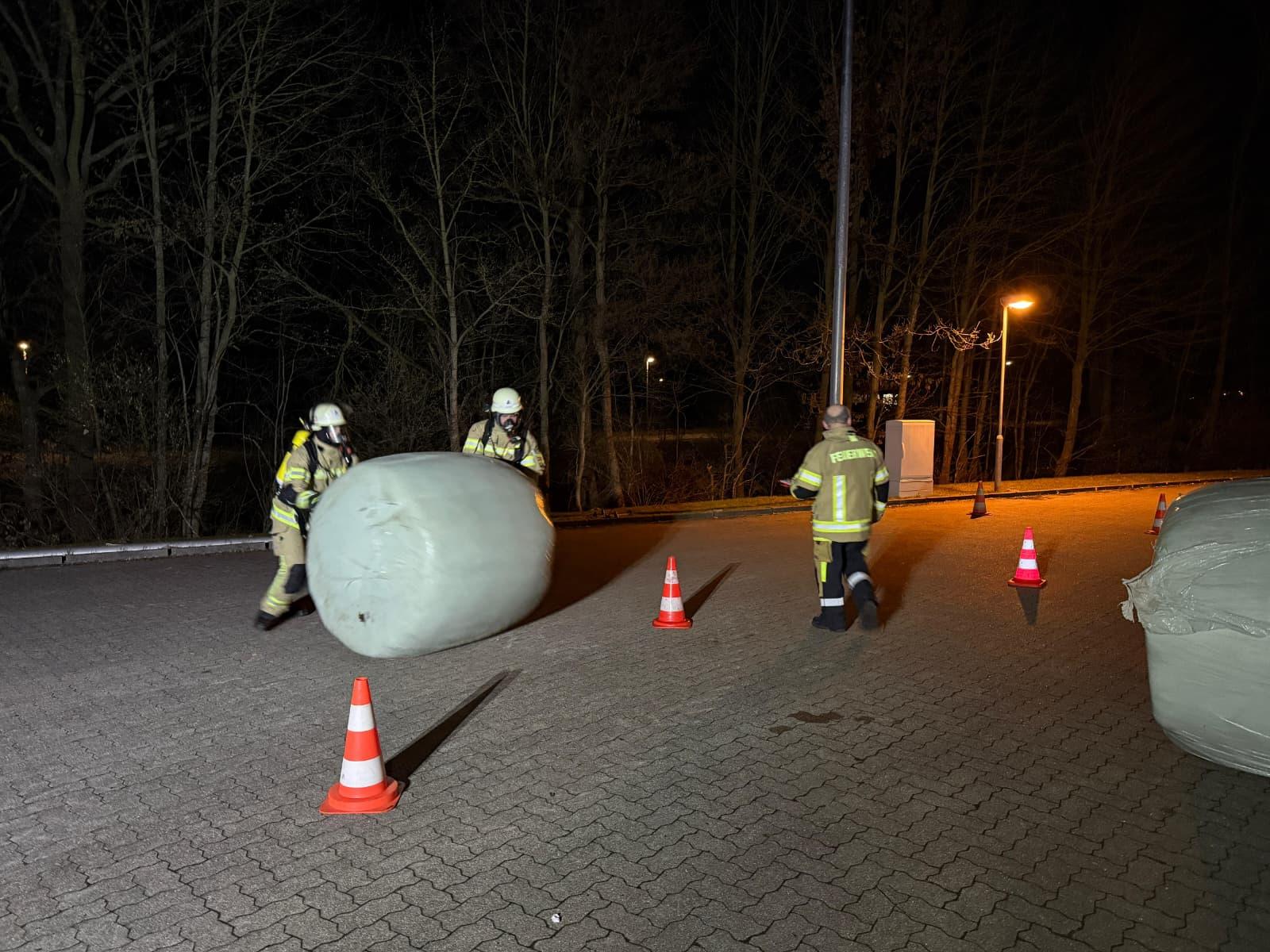 Ein Heuballen durch einen Parcours rollen – klingt simpel, ist es aber unter Atemschutz und voller Schutzausrüstung ganz und gar nicht.