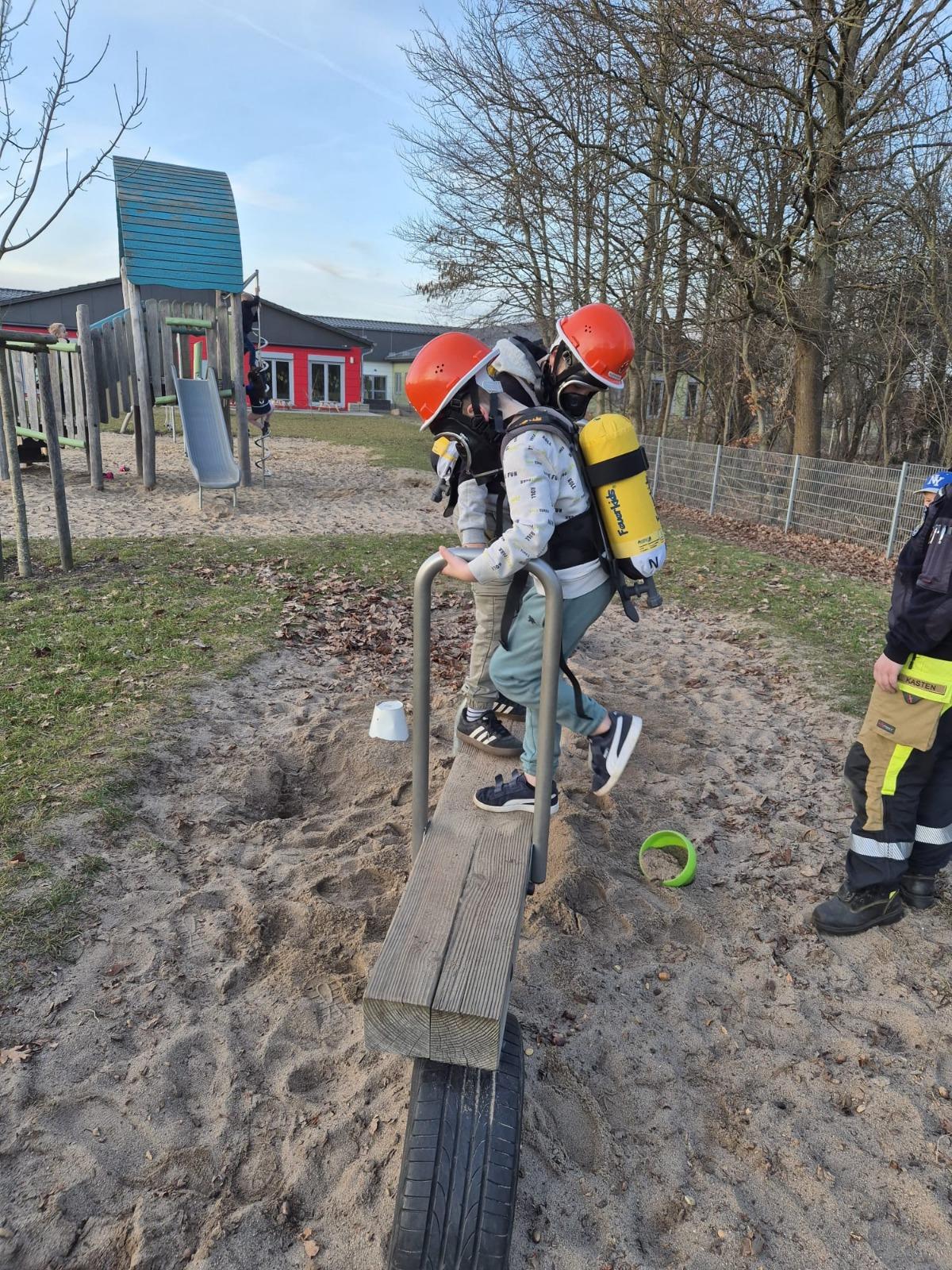 Dann hieß es: Ab in den Trupp! Ausgestattet mit unseren Atemschutz-Attrappen mussten die Kids einen Parcours bewältigen. Die Regel: Der Trupp bleibt zusammen und redet miteinander.